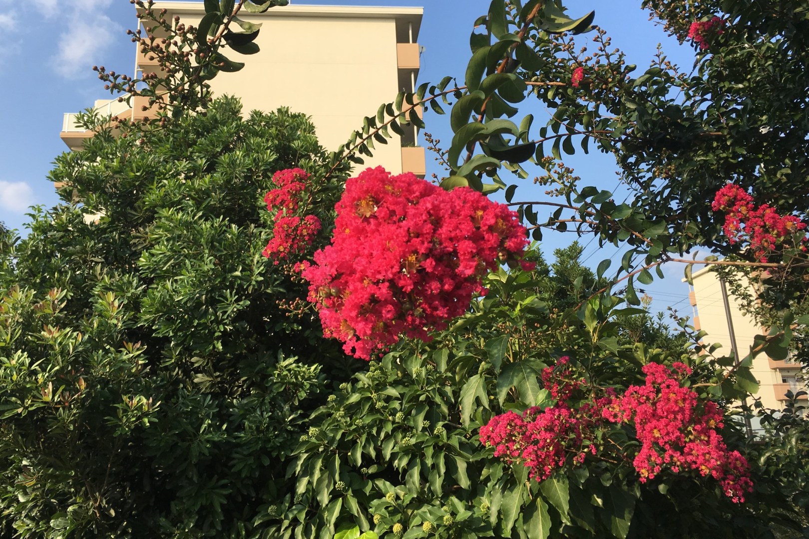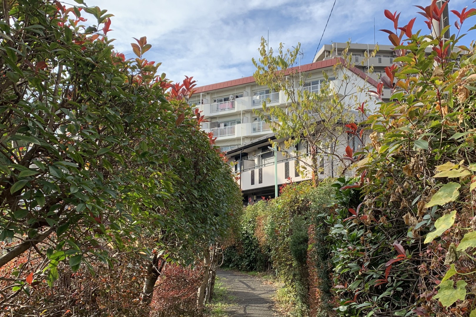 Lots of walkable paths, spacious apartment areas and flowers.