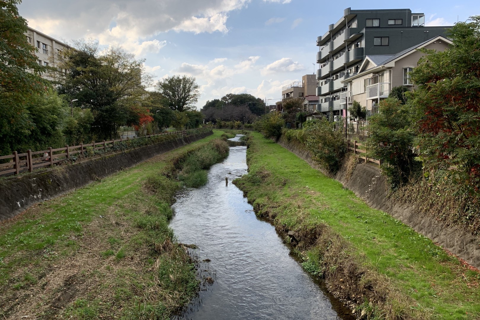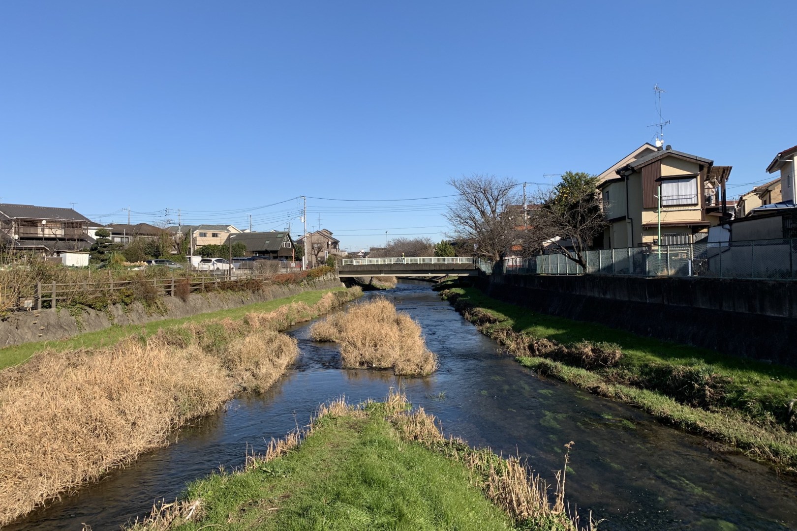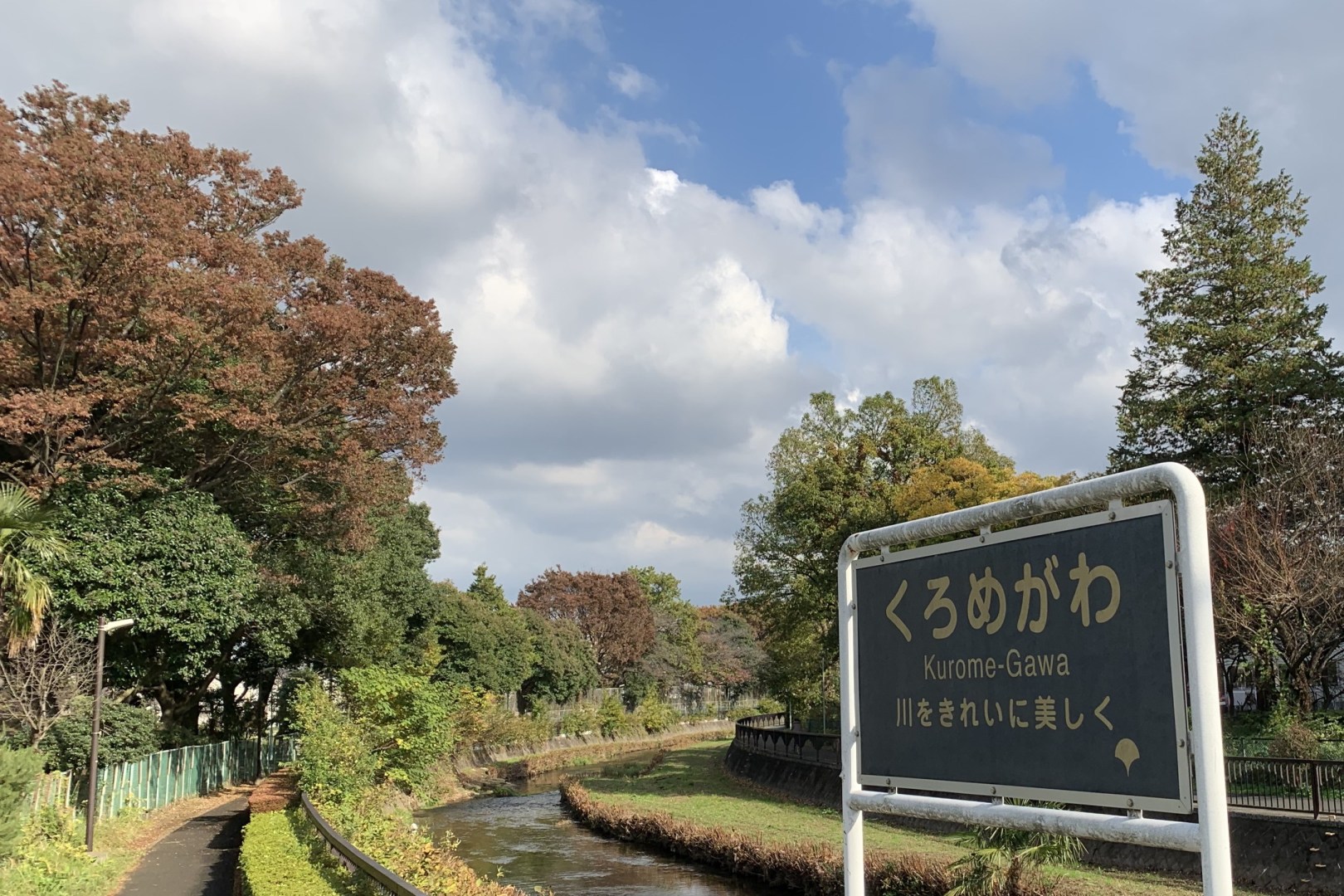 The geographical center of Higashikurume-shi with a beautiful riverside scenery.