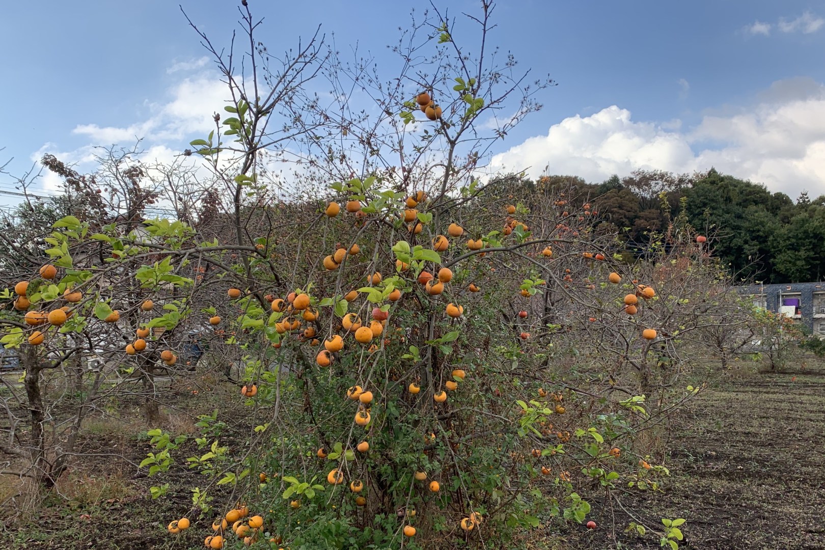 Residential areas, a forest park on a hill and large orchards.